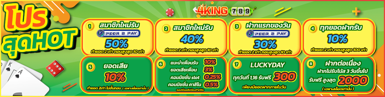 4king789 เว็บคาสิโนออนไลน์ชั้นนำที่มอบประสบการณ์การเดิมพันสุดพิเศษ พร้อมต้อนรับสมาชิกใหม่ด้วยโปรโมชั่นสุดคุ้มที่คุณไม่ควรพลาด เพื่อนๆ ที่สนใจสมัครสมาชิกกับเราวันนี้ รับทันทีเครดิตฟรีและโบนัสต้อนรับมูลค่าสูงสุดถึง 100% ของยอดฝากแรก